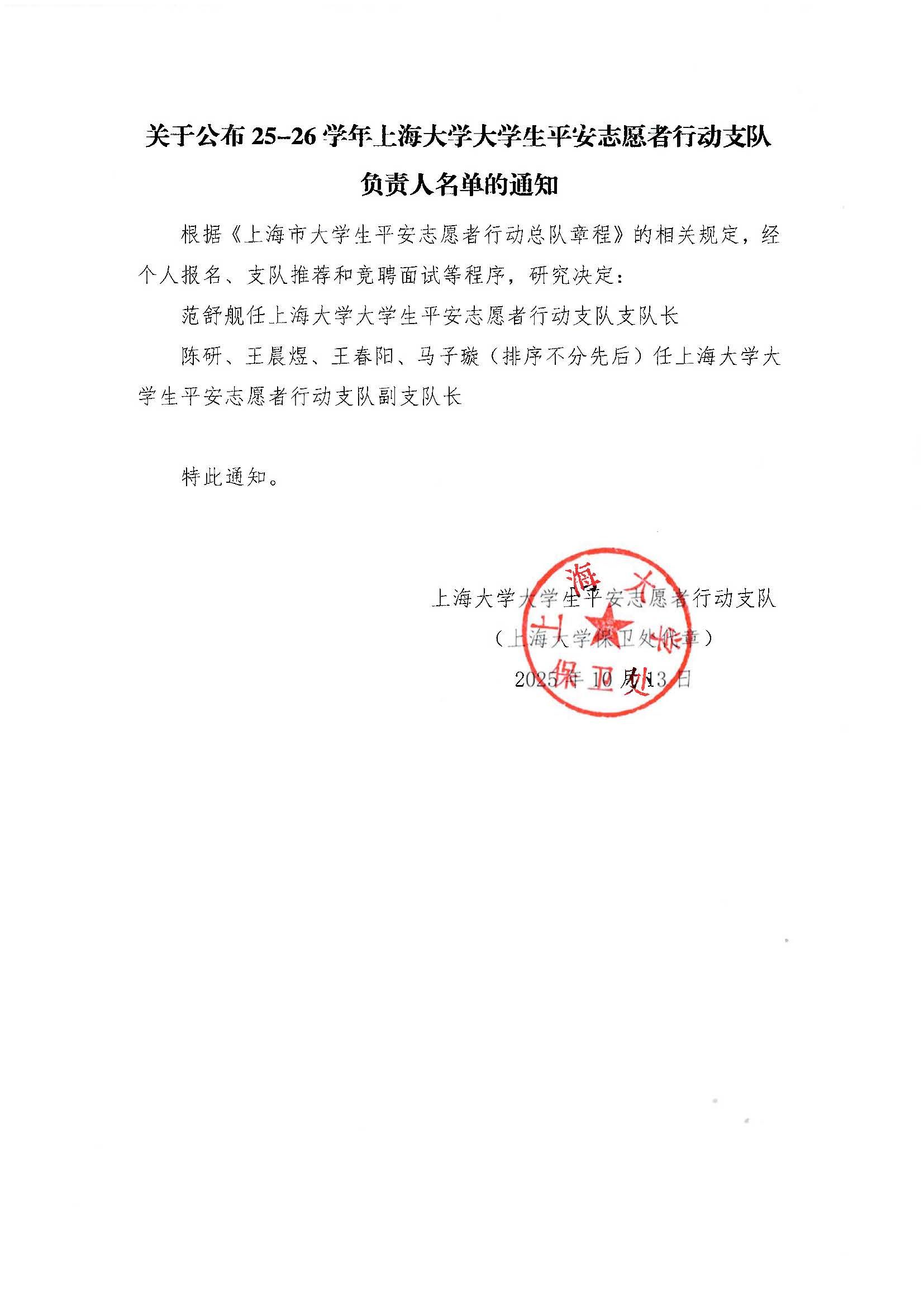 关于公布25-26学年上海大学大学生平安志愿者行动支队负责人名单的通知